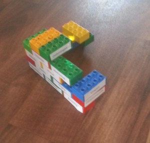 - Knip elk aspect uit (zorg dus voor voldoende knipruimte in je lijst) en plak elk afzonderlijk aspect met een plakbandje op de zijkant van een duploblokje.